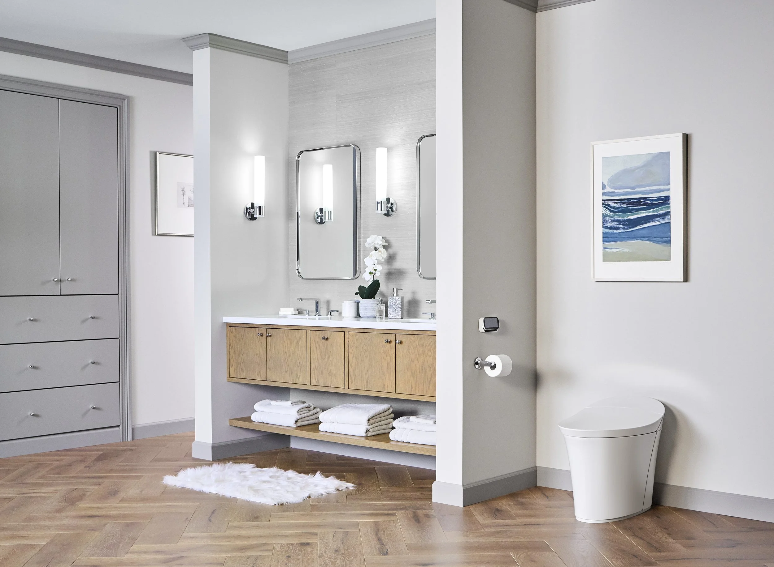 Among their products include Aleutian, a large bathroom sink and drawers with a clean, rounded curved design; the Tresham, a handsome, Shaker-style designed bathroom sink and storage; and the slew of smart toilets.