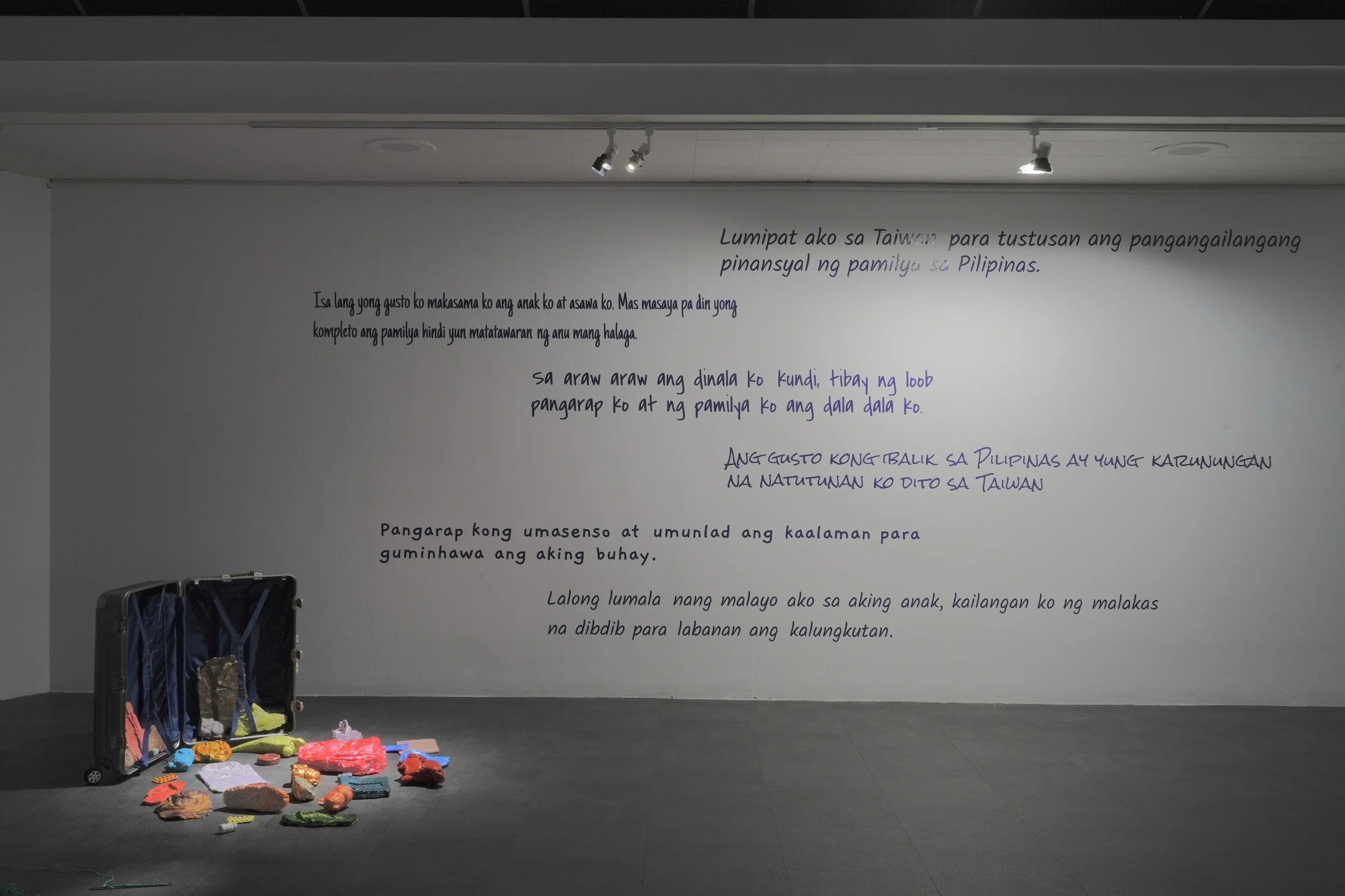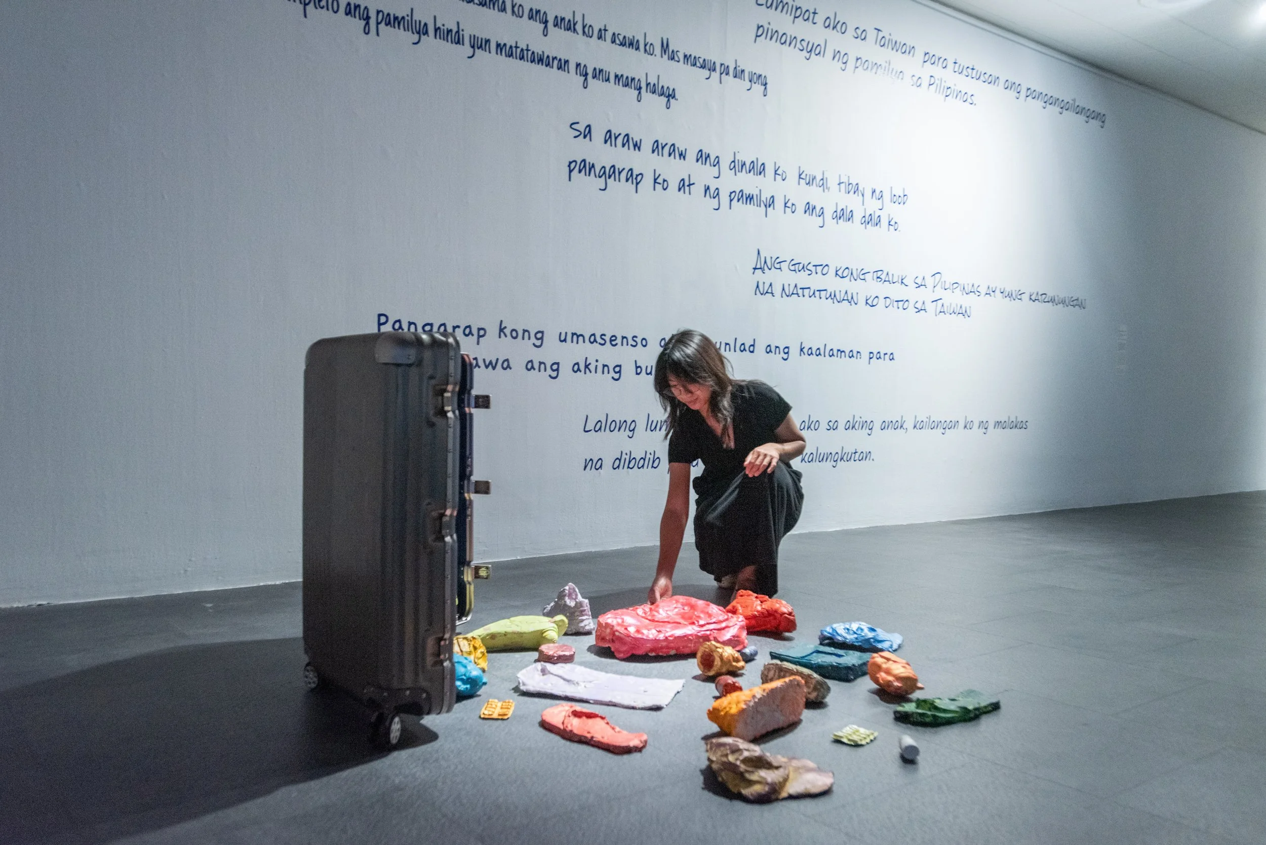 I chose Tawid Dagat as the exhibition title because it weaves through many seemingly disparate themes in my work. In Tagalog, tawid dagat emphasizes the journey itself. Whether through my own return to Manila Bay, my mother’s migration to the United States and her later retirement in the Philippines, or the countless OFWs who cross seas to work in places like Taiwan, each work in the exhibition engages with water and journeying in some form.