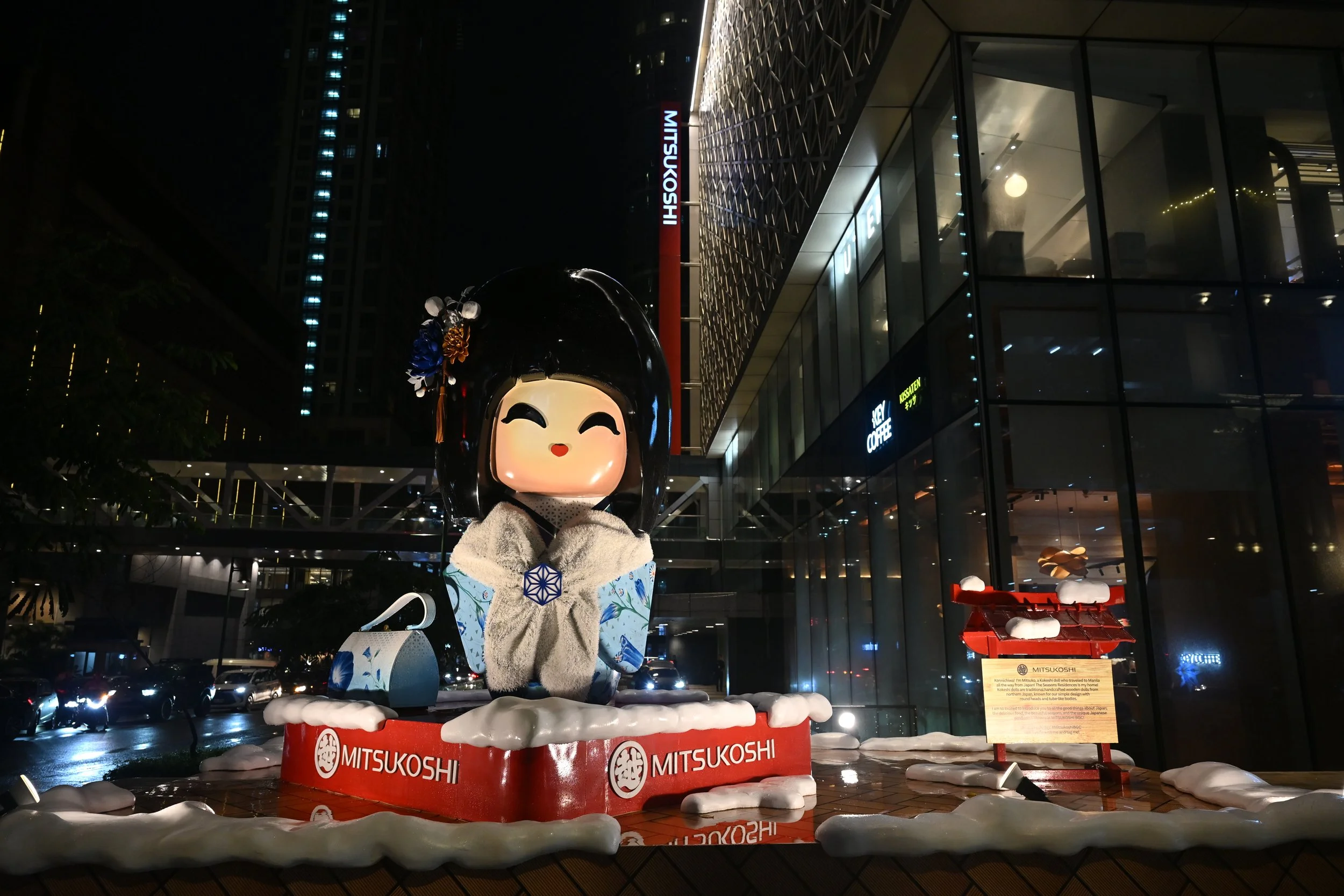 MITSUKO, the mall’s iconic Kokeshi doll, now dressed in her new festive outfit.