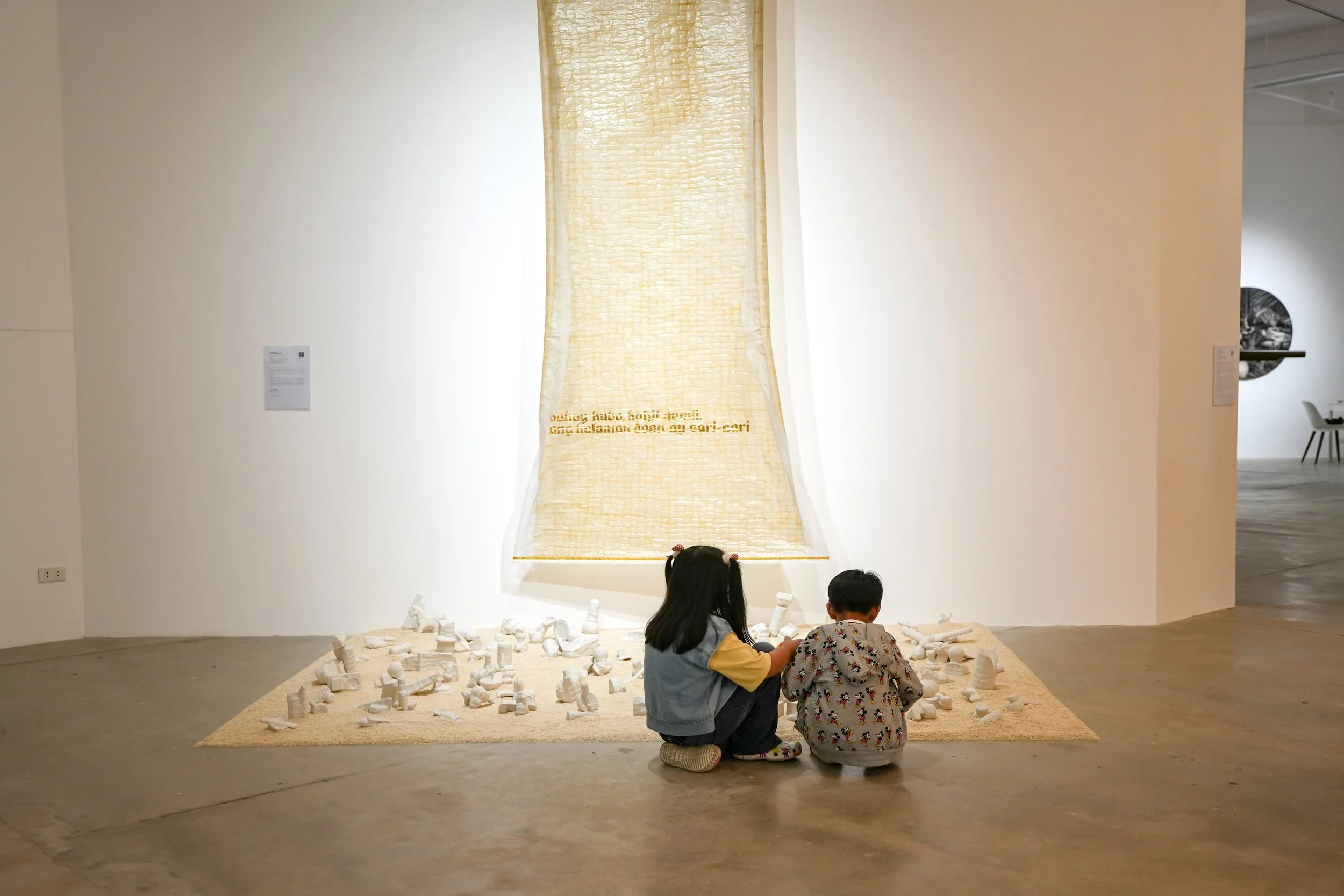 Growing up in Lucban, he was surrounded by objects deeply tied to agricultural life—rice, woven mats, textiles, and handmade ornaments. In Halik sa Lupa, these materials are recontextualized, transforming the ordinary into charged artistic language.
