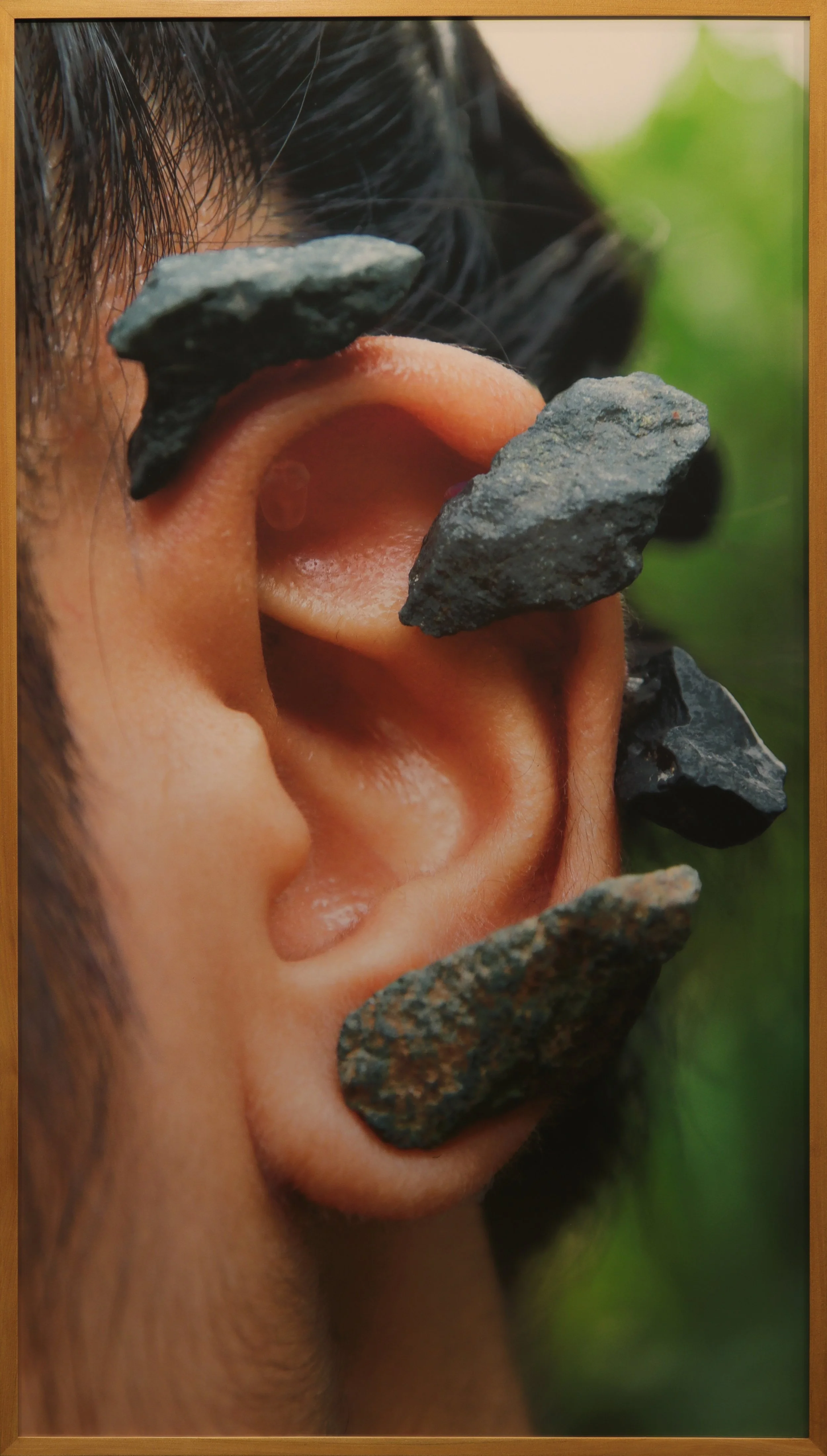 Untitled, 2018, diptych with inkjet print on archival paper and silicone, plastic, and rocks, 124.5 x 71.1cm and 30.5 x 27.5cm. Part of the solo exhibition The hand, the secretary, a landscape at the Center of the Philippines. Photography by Miguel Lorenzo Uy. Courtesy of the artist.
